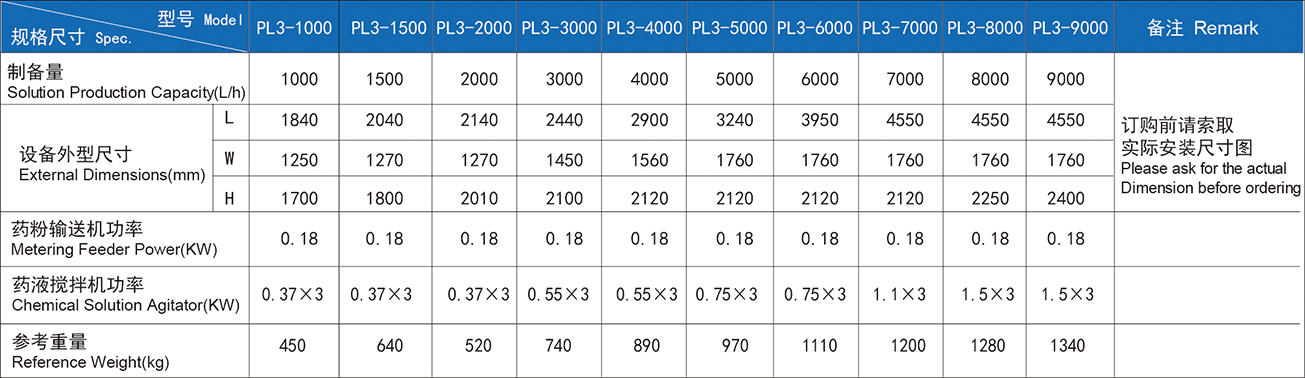 ระบบการเตรียมผงสามกล่องอัตโนมัติ PL3 แบ่งออกเป็นถังละลายถังบ่มและถังเก็บ สามารถควบคุมได้ด้วยตนเองหรือโดยอัตโนมัติ ระบบมีขนาดกะทัดรัดในโครงสร้างสามารถทำงานได้โดยอัตโนมัติและความเข้มข้นของการเตรียมสามารถปรับได้